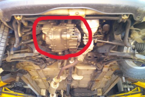 クラッチ部品を交換するにはトランスミッションを外さないと作業できません。(赤丸がトランスミッション)