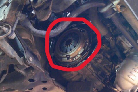 画像の赤丸が、クラッチカバー。この中にクラッチディスクがあります。