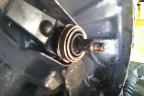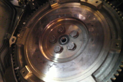 クラッチカバー・ディスクを取外し、フライホイールの真ん中についているパイロットベアリングを交換します。