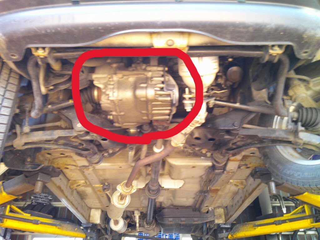 クラッチ部品を交換するにはトランスミッションを外さないと作業できません。(赤丸がトランスミッション)