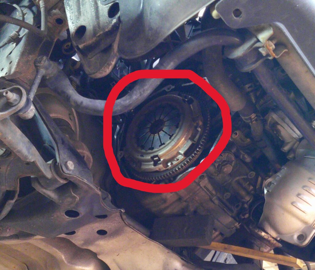 画像の赤丸が、クラッチカバー。この中にクラッチディスクがあります。