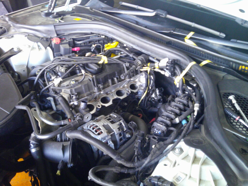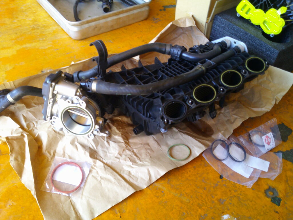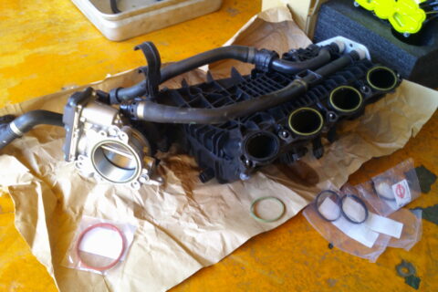 まずはインテークマニホールドを外さないと、どこから漏れているのか確認できないので、外します。